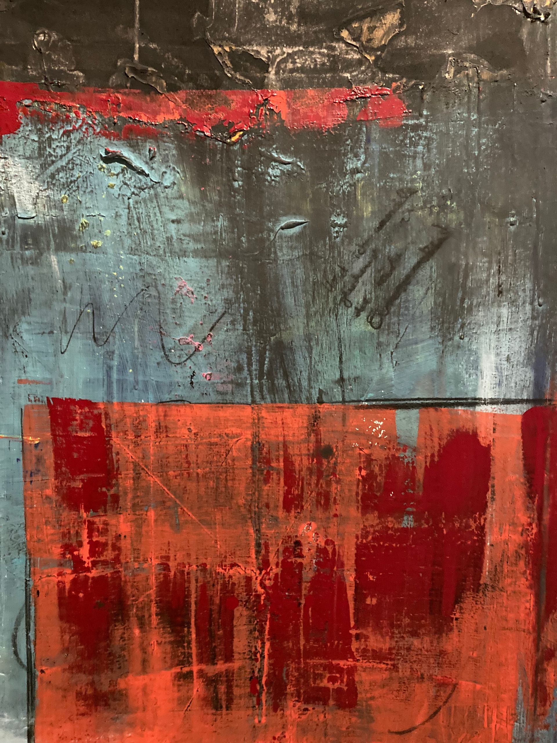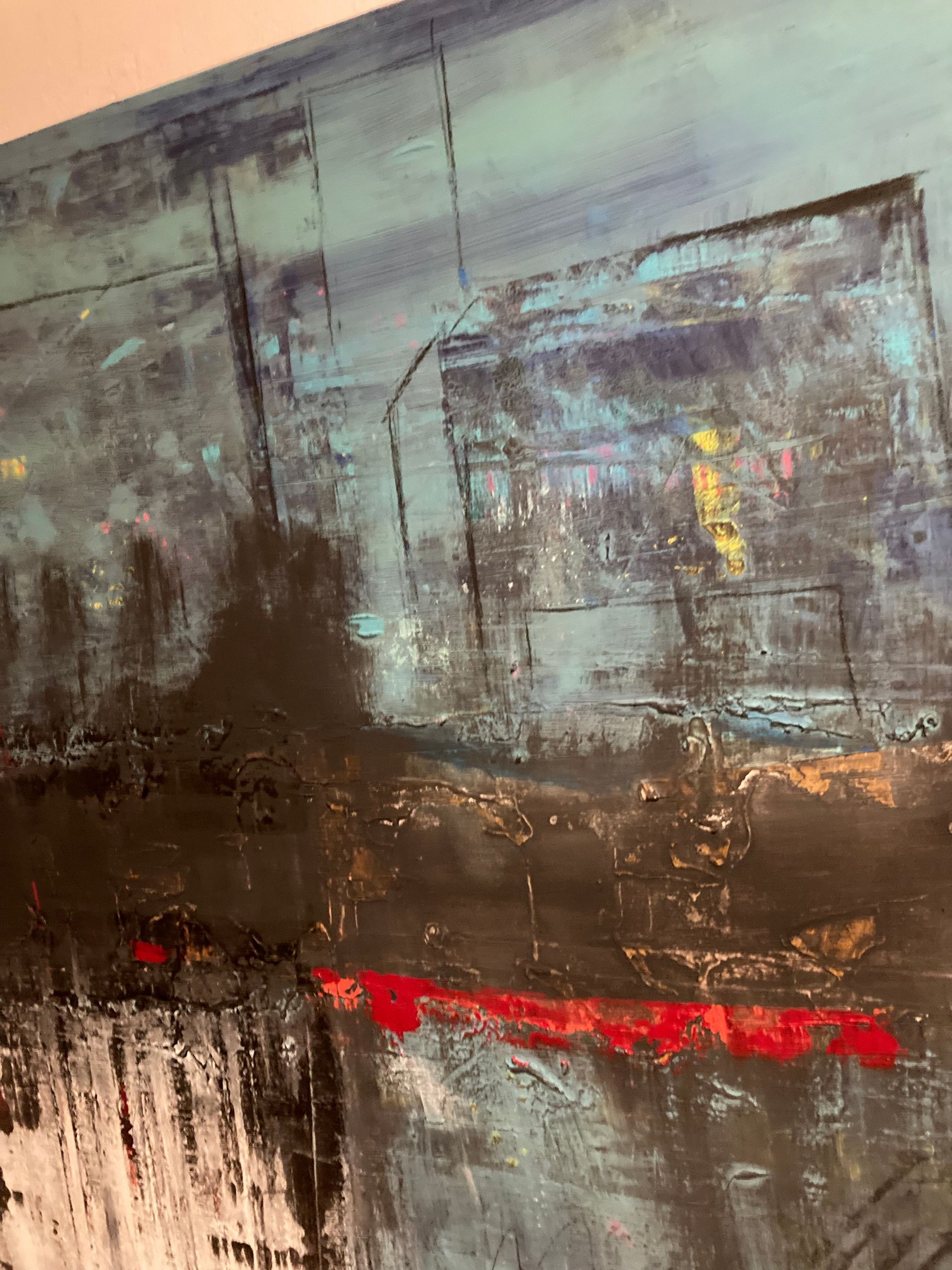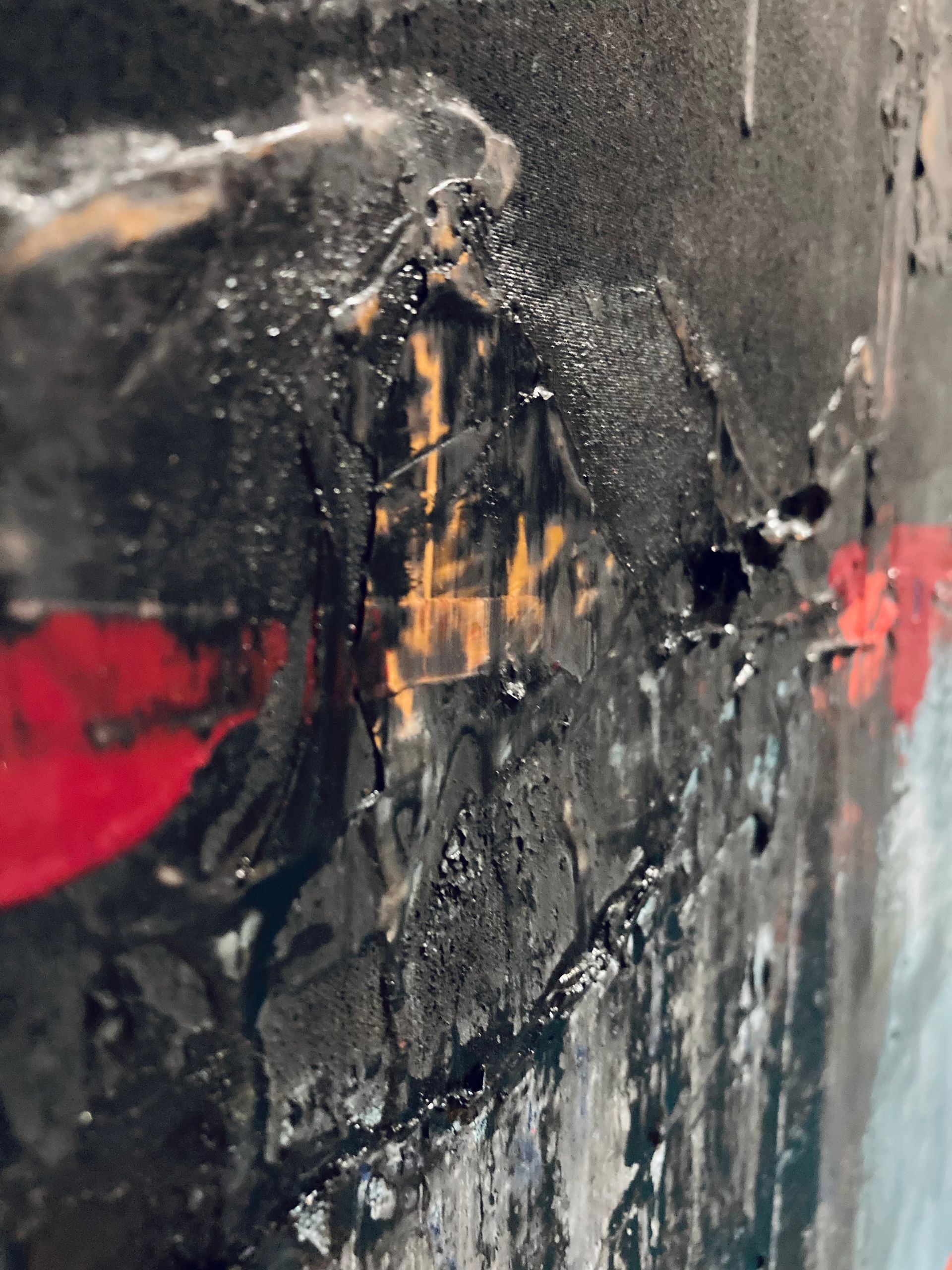 Auf 140x124cm finden sich nun neue Emotionen und Interpretationsspielraum wieder. Die alten Ideen schimmern noch so leicht hindurch, wodurch das Bild eine richtig schöne Tiefe bekommen hat. Klare Formen lösen abstrakte ab und das Zusammenspiel der wenigen Farben harmoniert nicht nur auf dem ersten Blick!