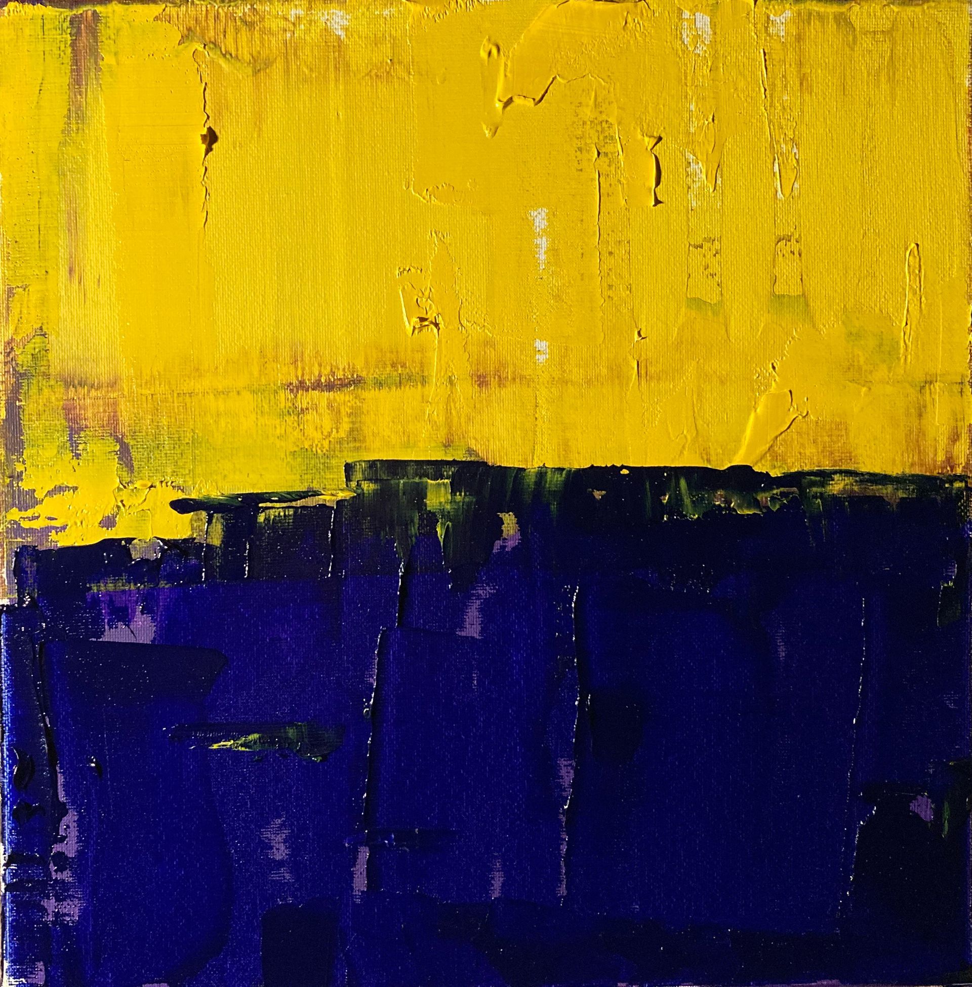 Das Zusammenspiel von Gelb-Blau- und Weißtönen harmoniert hier besonders gut und gibt dem Bild Lebendigkeit. Auch hier wurde mit Acryl und Spachteln gearbeitet.