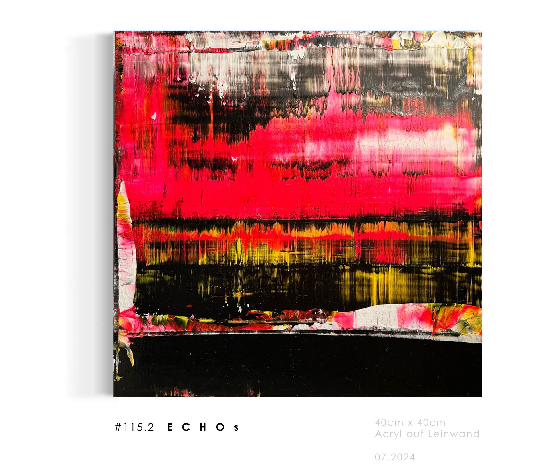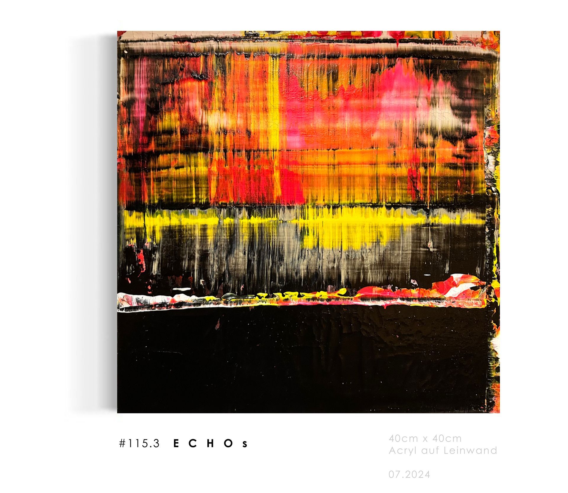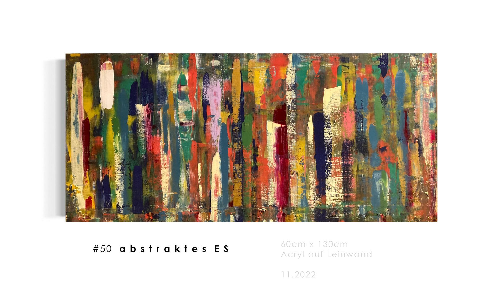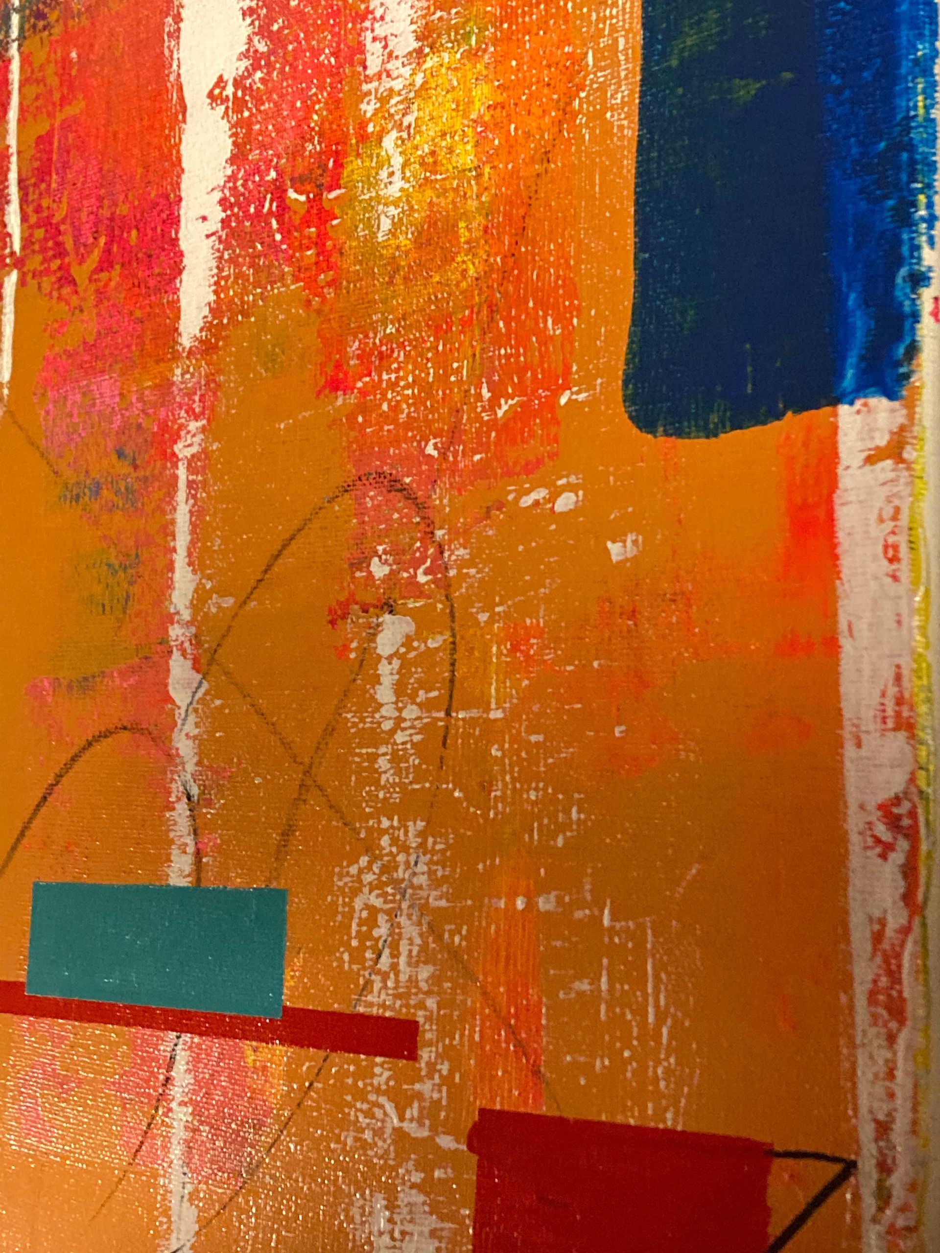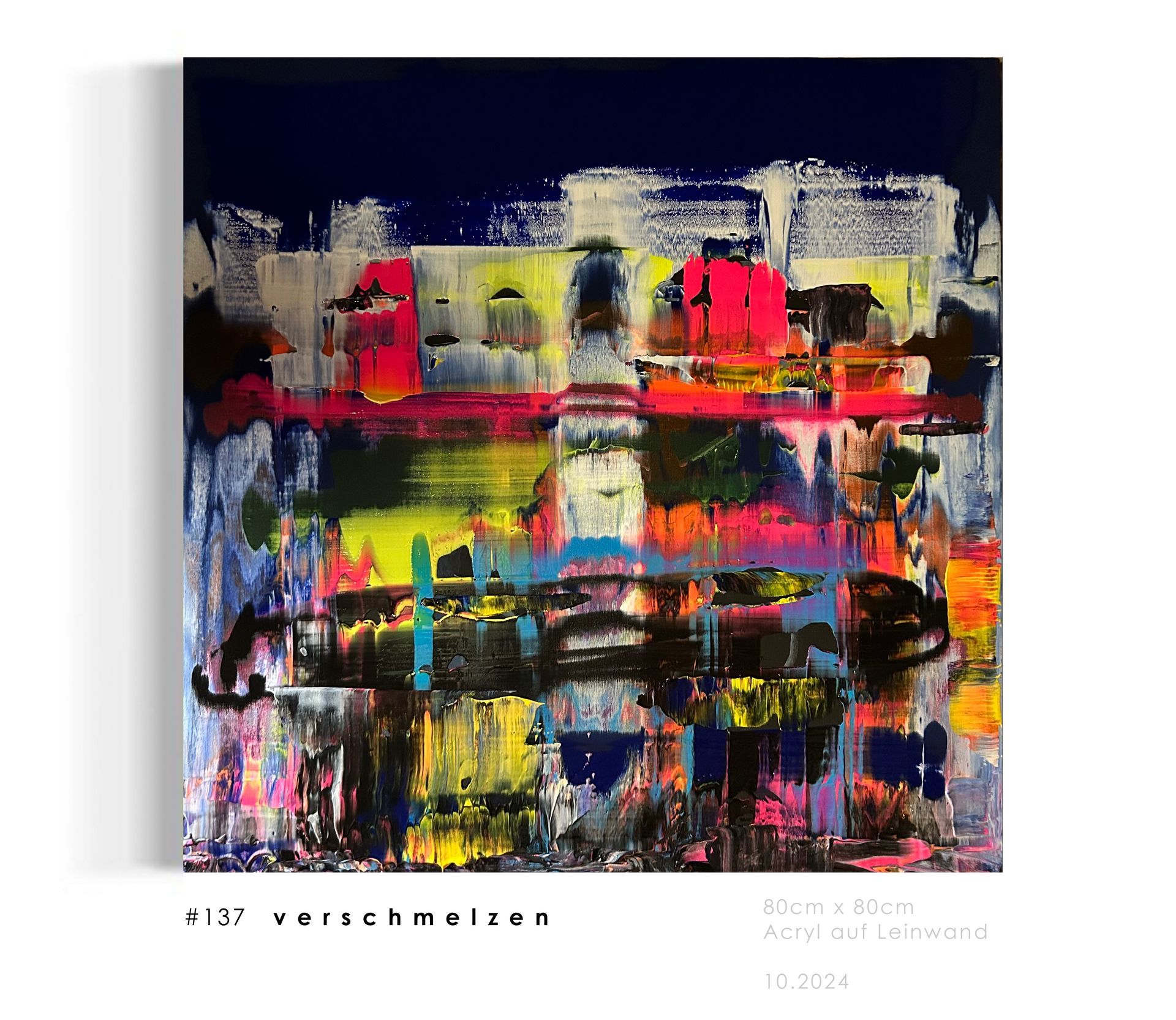 In dieser sehr abstrakten Arbeit finden sich viele Farben wieder, die auf den ersten Blick unruhig wirken. Bei längerer Betrachtung hingegen wird der Blick ruhiger und die Aufgeregtheit weicht einer Wärme in der das Zusammenspiel der Farben im besten Fall Emotionen auslöst.