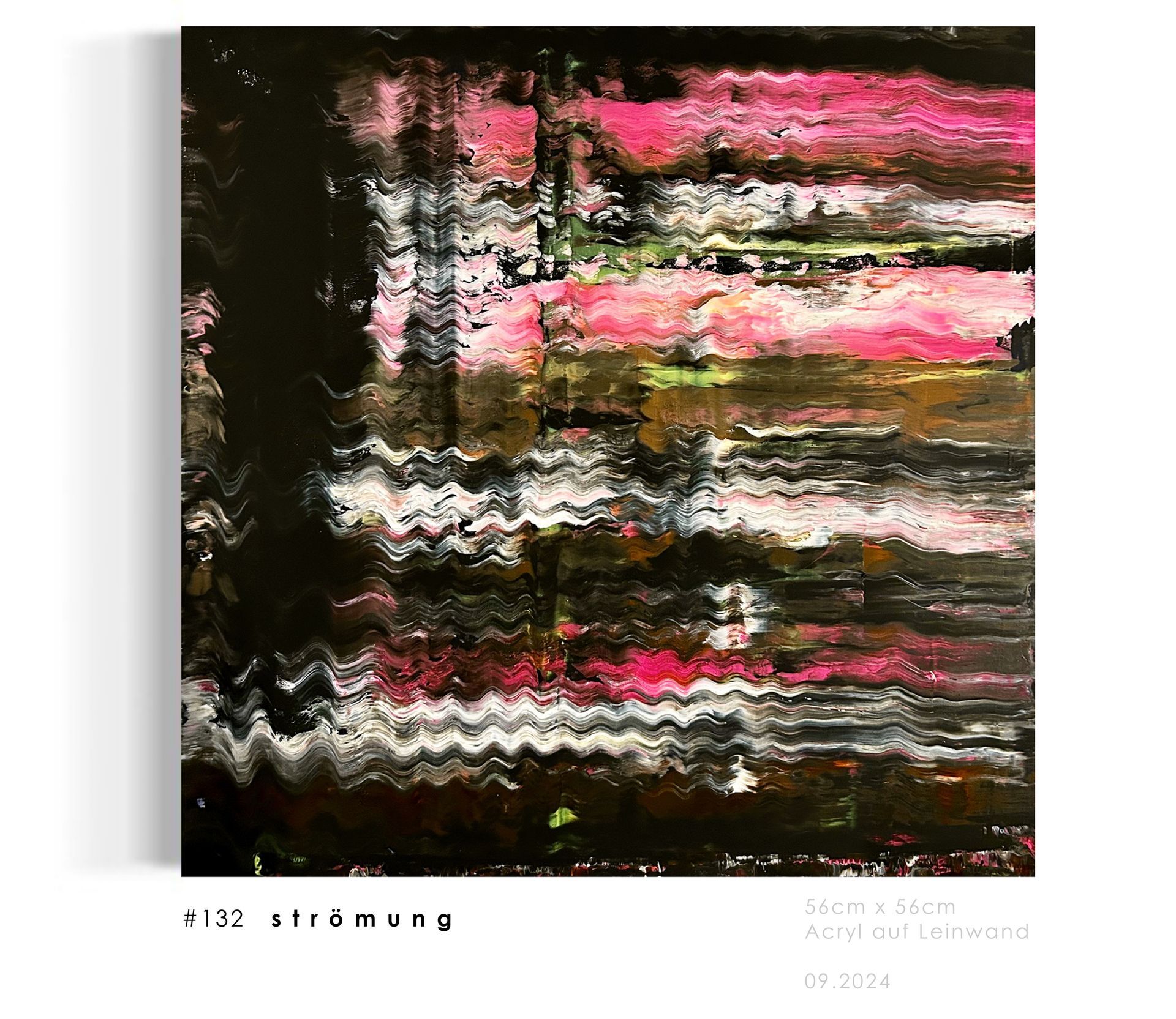 Dies ist mein hundertstes Bild und es trägt den Namen #100emportauchen. Zum feierlichen Anlass auf dem Bild feines Blattgold mit verarbeitet. Durch den goldenen Schimmer, welcher immer wieder das Licht sucht, bekommt das Bild eine festliche Note. Es harmoniert mit den 3 Grundfarben ( weiß, schwarz und neonrosa) und fügt sich fließend ins Gesamtbild mit ein.